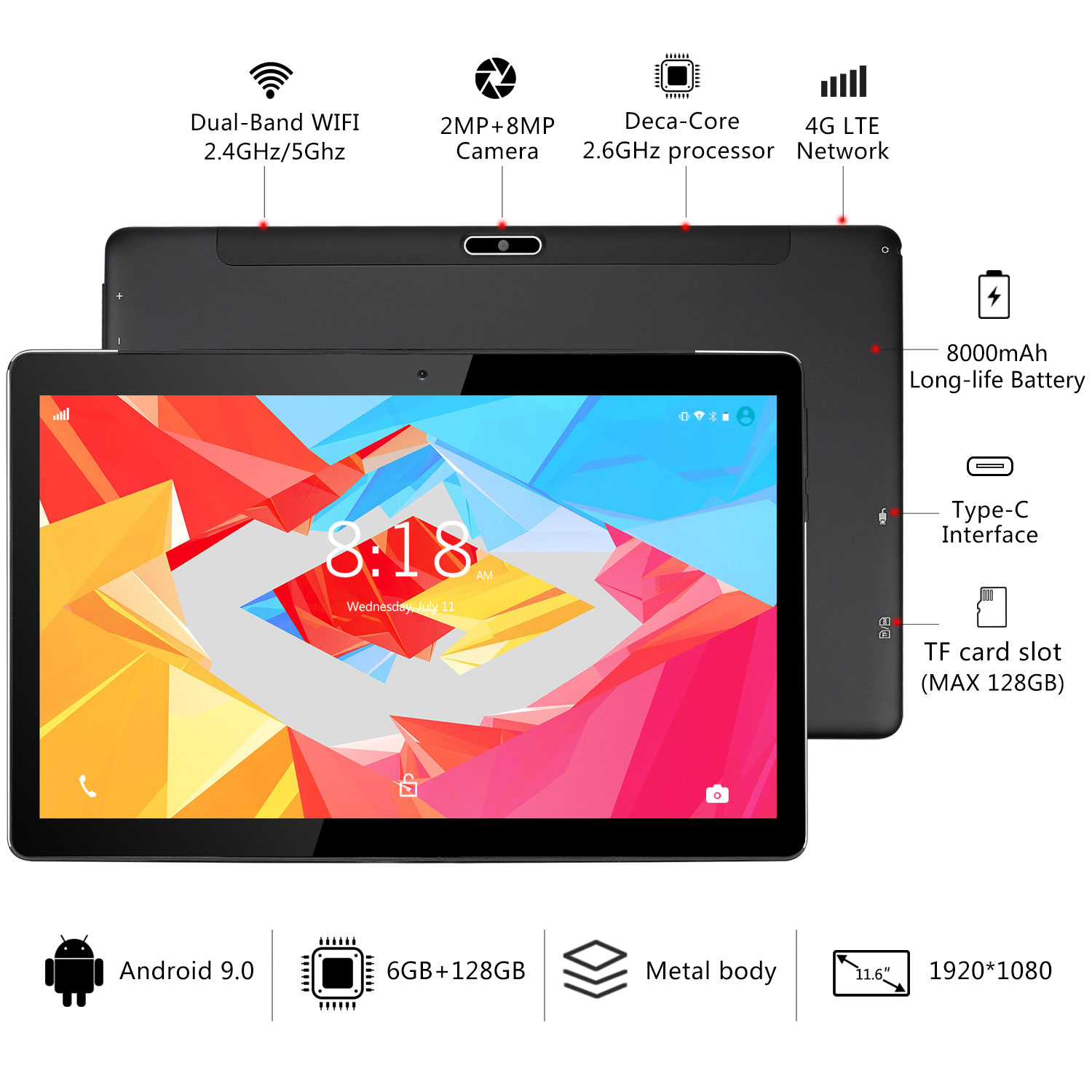 11.6-inch 1920 x 1080 Full HD display screen with dual cameras (2MP and 8MP),